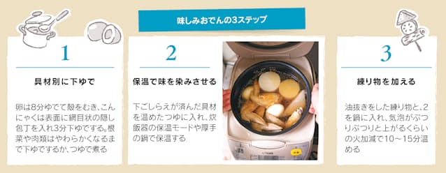 下ごしらえした野菜、ゆで卵、こんにゃく、肉類を炊飯器の内釜に入れ、温めたつゆを注いで保温しておく。練り物は早くから入れると味が抜けてしまうし内釜に入りきらないので、食べる直前に炊飯器の中身と一緒に鍋に入れ、軽く煮て仕上げるとよい。
